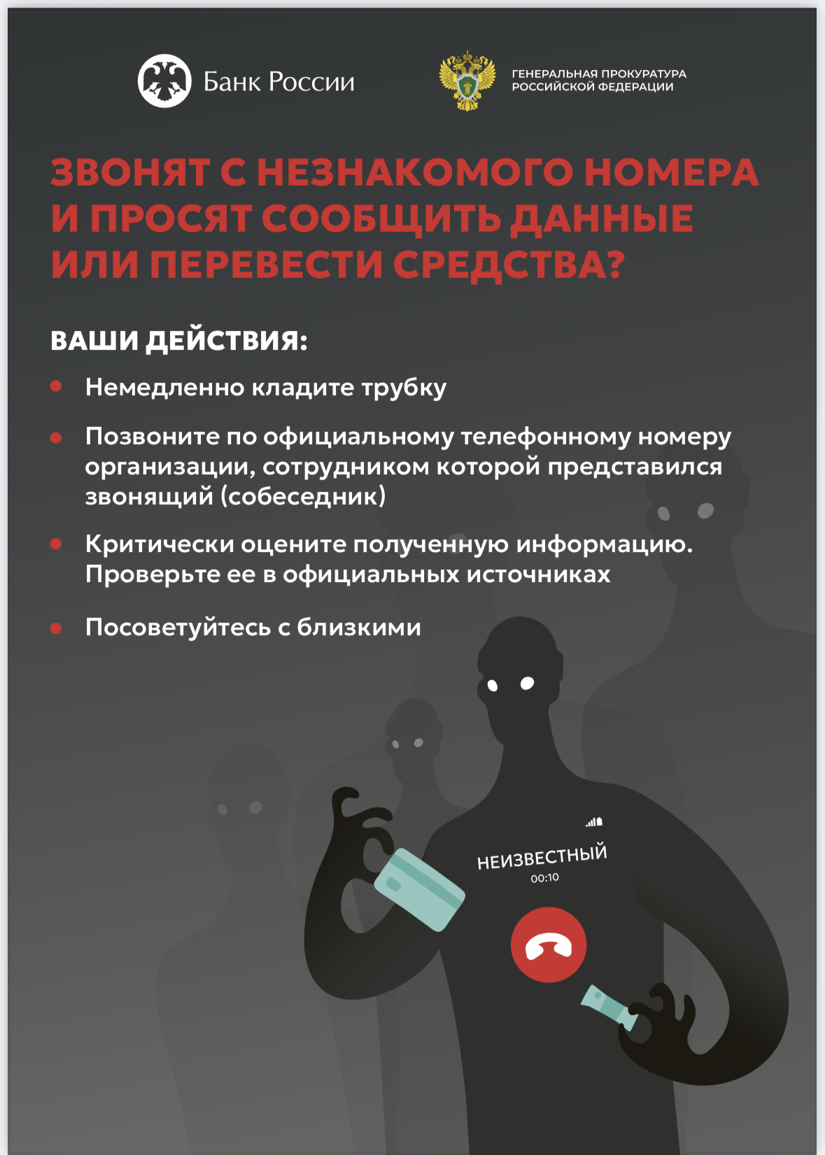 |  |  | В России стартовала информационная кампания по кибербезопасности «Клади трубку»! Вас убеждают перевести деньги на "безопасный счет"? Представляются сотрудниками силовых структур? Представляются сотрудниками почты, горгаза, соцработниками и др. Просят код из СМС? ЭТО МОШЕННИКИ! Будьте бдительны и поделитесь информацией с близкими!